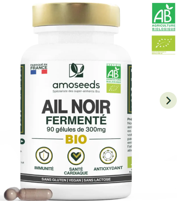 - CERTIFIÉ BIOLOGIQUE : boîte refermable recyclable de 90 gélules de 300 mg de poudre d’Ail Noir Biologique de Qualité Supérieure amoseeds. Produit 100 % vegan, sans conservateur, sans OGM, sans pesticides, sans colorant artificiel, sans gluten et sans lactose. Chaque lot est testé par des tiers afin de s’assurer de leur qualité et leur pureté.