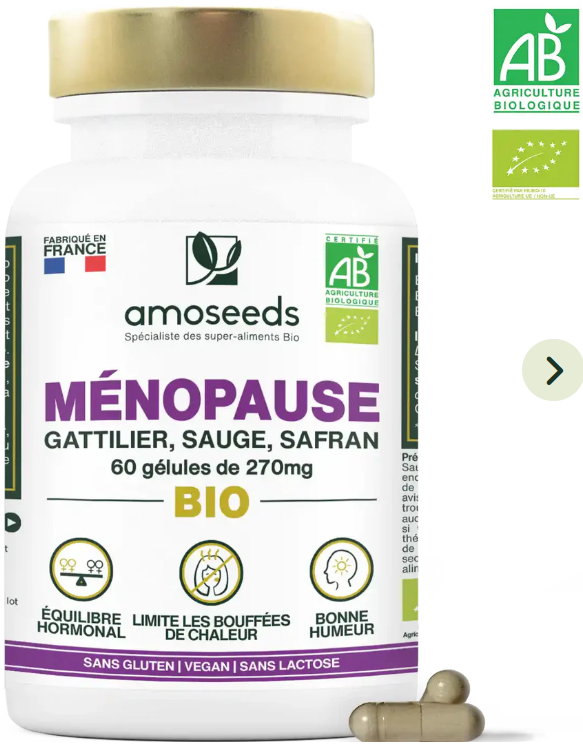 - FORMULE COMPLÈTE : nos gélules de Complexe Ménopause Bio, à base de Gattilier Bio, Sauge Bio et Safran Bio vous offrent une grande efficacité. Grâce à la complémentarité des bienfaits de chaque plante, notre formule est la plus complète du marché et vous permettra de réguler à la fois votre équilibre hormonal, vos bouffées de chaleur, votre humeur mais aussi votre libido. Formulé sans hormone et sans phyto-œstrogènes, notre complexe sera une solution idéale et 100% naturelle pour améliorer votre confort en période de ménopause ou de périménopause. Avec notre Complexe Ménopause Bio, retrouvez calme, sérénité, et soulagez vos gênes.