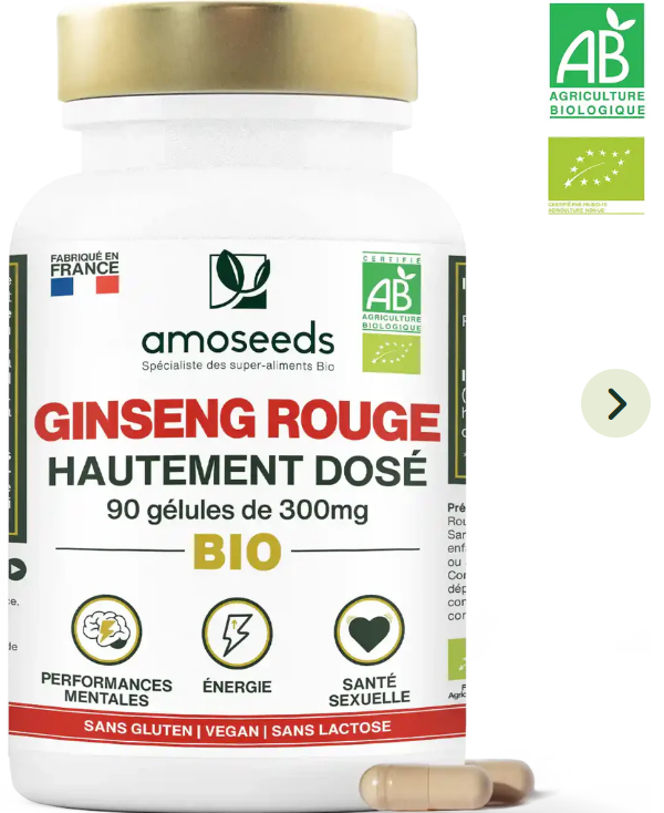 - CERTIFIÉ BIOLOGIQUE : boîte refermable recyclable de 90 gélules de 300 mg de poudre de Ginseng Rouge Biologique de Qualité Supérieure amoseeds. Produit 100% pur, vegan, sans additif, sans conservateur, sans OGM, sans pesticides, sans colorant artificiel, sans gluten et sans lactose. Chaque lot est testé par des tiers afin de s’assurer de leur qualité et leur pureté. Produit analysé et conditionné en France.