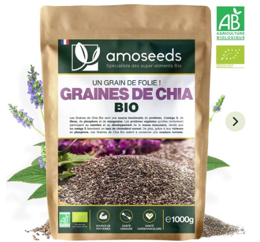 - CERTIFIÉES BIOLOGIQUES : sachet Kraft refermable et recyclable de 1 kg de Graines de Chia Bio de Qualité Supérieure amoseeds. Produit 100 % naturel, pur, vegan, sans additif, sans conservateur, sans OGM, sans pesticides, sans colorant artificiel, sans lactose, sans soja et sans gluten. Chaque lot est testé par des tiers afin de s’assurer de leur qualité et leur pureté.