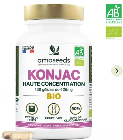 • PERTE DE POIDS : d’après la Commission européenne, l’effet bénéfique du glucomannane de Konjac sur la perte de poids est obtenu grâce à la consommation journalière de 3 g de glucomannane en trois doses de 1 g chacune, prises avec 1 à 2 verres d’eau, avant les repas et dans le cadre d’un régime hypocalorique. Grâce à la haute concentration de nos gélules de Konjac Bio, vous bénéficierez de cet effet coupe-faim naturel en consommant seulement 6 petites gélules par jour : 2 le matin, 2 le midi et 2 le soir. De plus, en favorisant la satiété, le glucomannane aide également à limiter les grignotages et à réduire les prises alimentaires lors des repas. Cette action contribue à éviter la surconsommation alimentaire et à diminuer l’apport calorique de la journée, ce qui favorise la perte de poids.