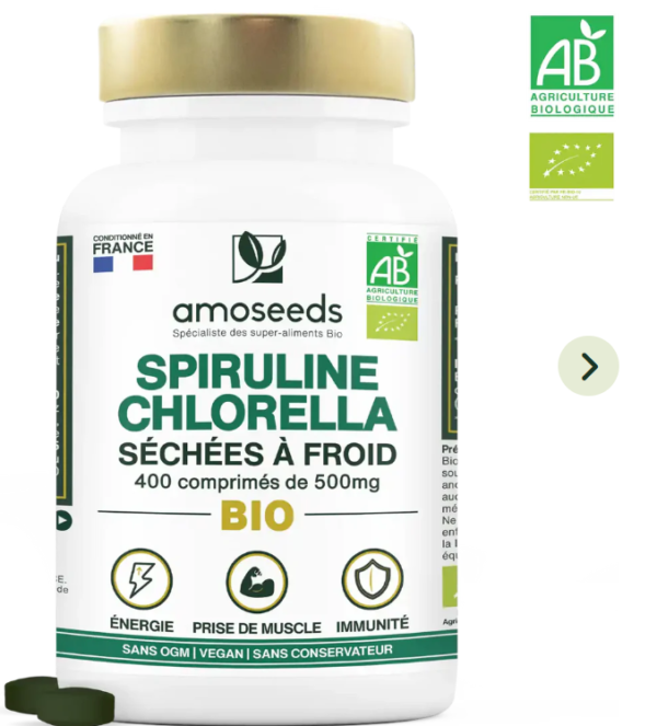- CERTIFIÉ BIOLOGIQUE : boîte refermable recyclable de 400 comprimés de 500 mg contenant chacun 250 mg de poudre de Spiruline Biologique titrée à 17% de phycocyanine et 250 mg de poudre de Chlorella Biologique de Qualité Supérieure amoseeds. Produit 100 % pur, vegan, sans additif, sans conservateur, sans OGM, sans pesticides, sans colorant artificiel, sans gluten et sans lactose. Chaque lot est testé par des tiers afin de s’assurer de leur qualité et leur pureté. Produit conditionné en France.