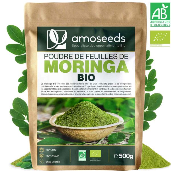 • CERTIFIÉE BIOLOGIQUE : sachet Kraft refermable et recyclable de 500 g de poudre de feuilles de Moringa Bio de Qualité Supérieure amoseeds. Produit 100 % naturel, pur, vegan, sans additif, sans conservateur, sans OGM, sans pesticide, sans colorant artificiel, sans lactose, sans soja et sans gluten. Chaque lot est testé par des tiers afin de s’assurer de leur qualité et leur pureté.