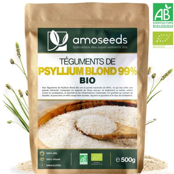 - CERTIFIÉ BIOLOGIQUE : sachet Kraft refermable et recyclable de 500g de téguments de psyllium blond Bio de Qualité Supérieure amoseeds d’une pureté maximale de 99%. Produit 100% naturel, végan, sans oxyde d’éthylène, sans additif, sans conservateur, sans OGM, sans pesticide, sans colorant artificiel, sans lactose, sans soja et sans gluten. Chaque lot est testé par des tiers afin de s’assurer de leur qualité et leur pureté.